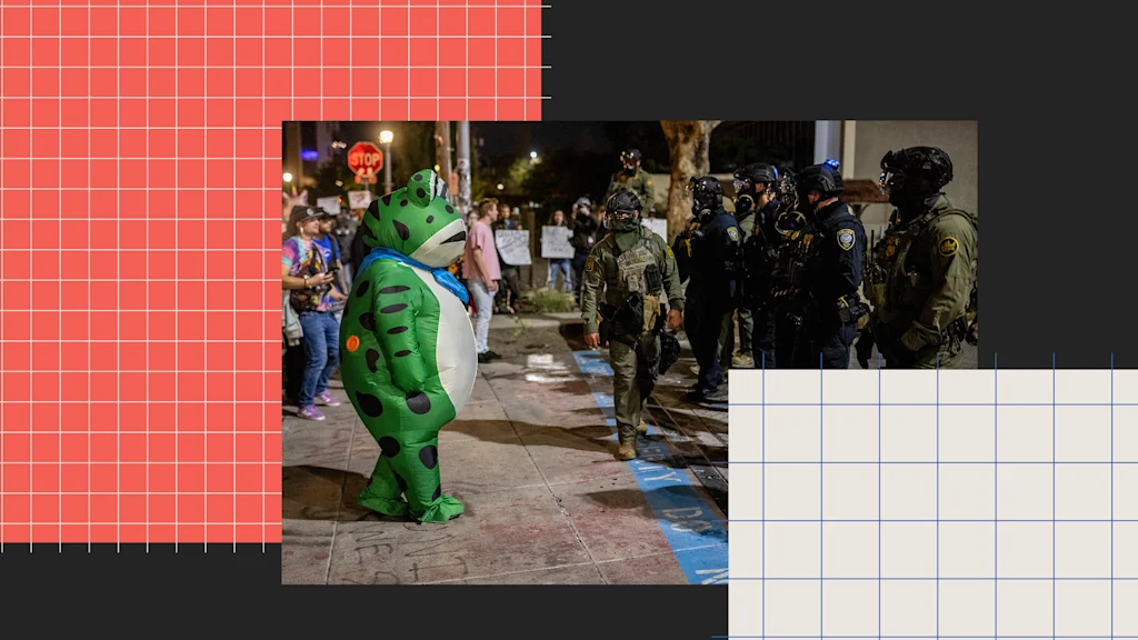 Video of Seth Todd, a protester outside an ICE facility in Portland, Oregon, being chemical-sprayed by law enforcement went viral, one assumes, largely because he was wearing an inflatable frog costume. The absurdity was, after all, the point. The outfit’s success at making heavy-handed tactics look both bullying and clueless is why inflatable costumes—sharks, chickens, etc.—became a popular form of protest-wear. It’s an example of “tactical frivolity” as a form of resistance that defangs accusations of violent opposition. As one observer put it: It’s hard to be violent in a frog suit.