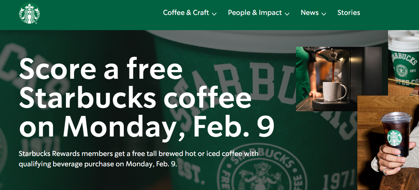 - Starbucks is offering rewards members a free tall brewed hot or iced coffee with any beverage purchase on 2/9/26