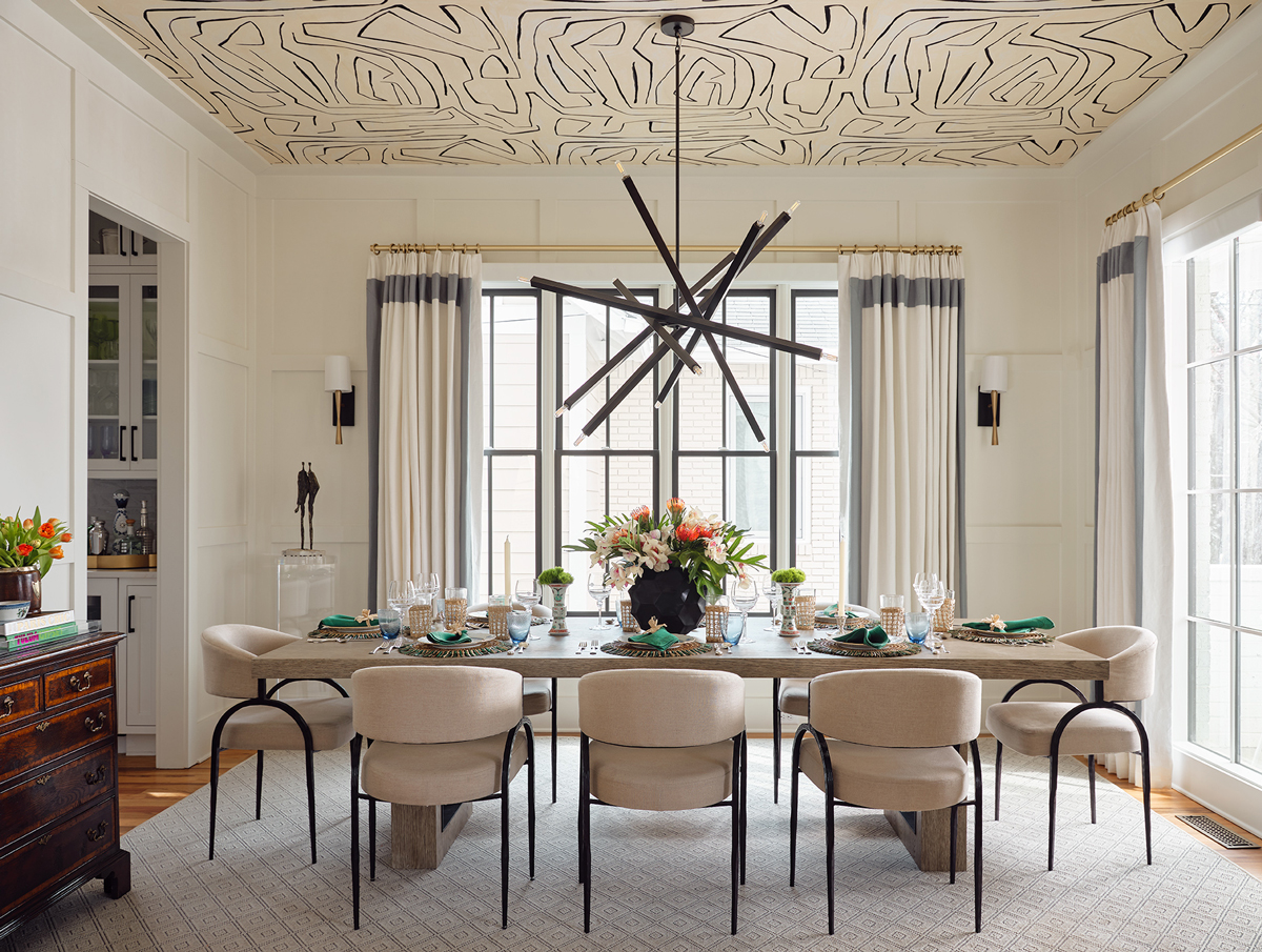 Pattern further softens the once-spare backdrop. A monkey-strewn Cole & Son wallpaper enlivens the powder room, while a Kelly Wearstler for Lee Jofa wallcovering clads the dining room ceiling, suggesting a house that has evolved over time. The room’s dramatic black chandelier ties back to the permanent fixtures, while convivial seating groups—clubby swivel chairs and ottomans in the library, and a flexible arrangement in the family room where an acrylic backgammon table stands at attention—reflect the couple’s love of games, friends, and fun evenings in.