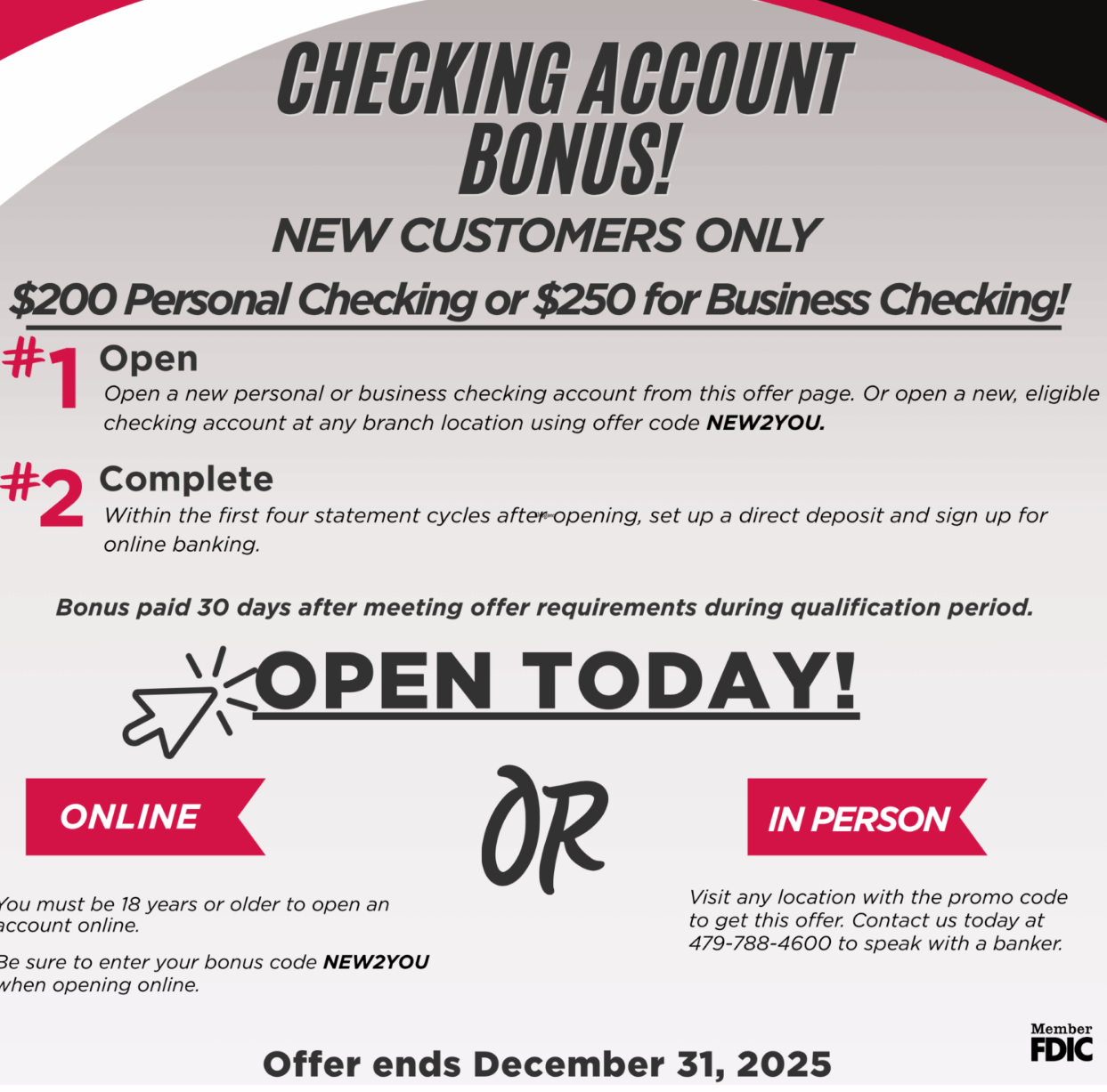 - First National Bank of Fort Smith is offering a $200 personal checking & $250 business checking bonus.