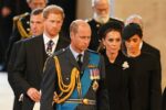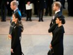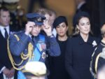 The coffin of Queen Elizabeth II, draped in the Royal Standard with the Imperial State Crown placed on top, is carried on a horse-drawn gun carriage of the King’s Troop Royal Horse Artillery, during the ceremonial procession from Buckingham Palace to Westminster Hall, London, where it will lie in state ahead of her funeral on MondayFeaturing: Prince William, Catherine Princess of Wales, Prince Harry, Meghan Duchess of Sussex