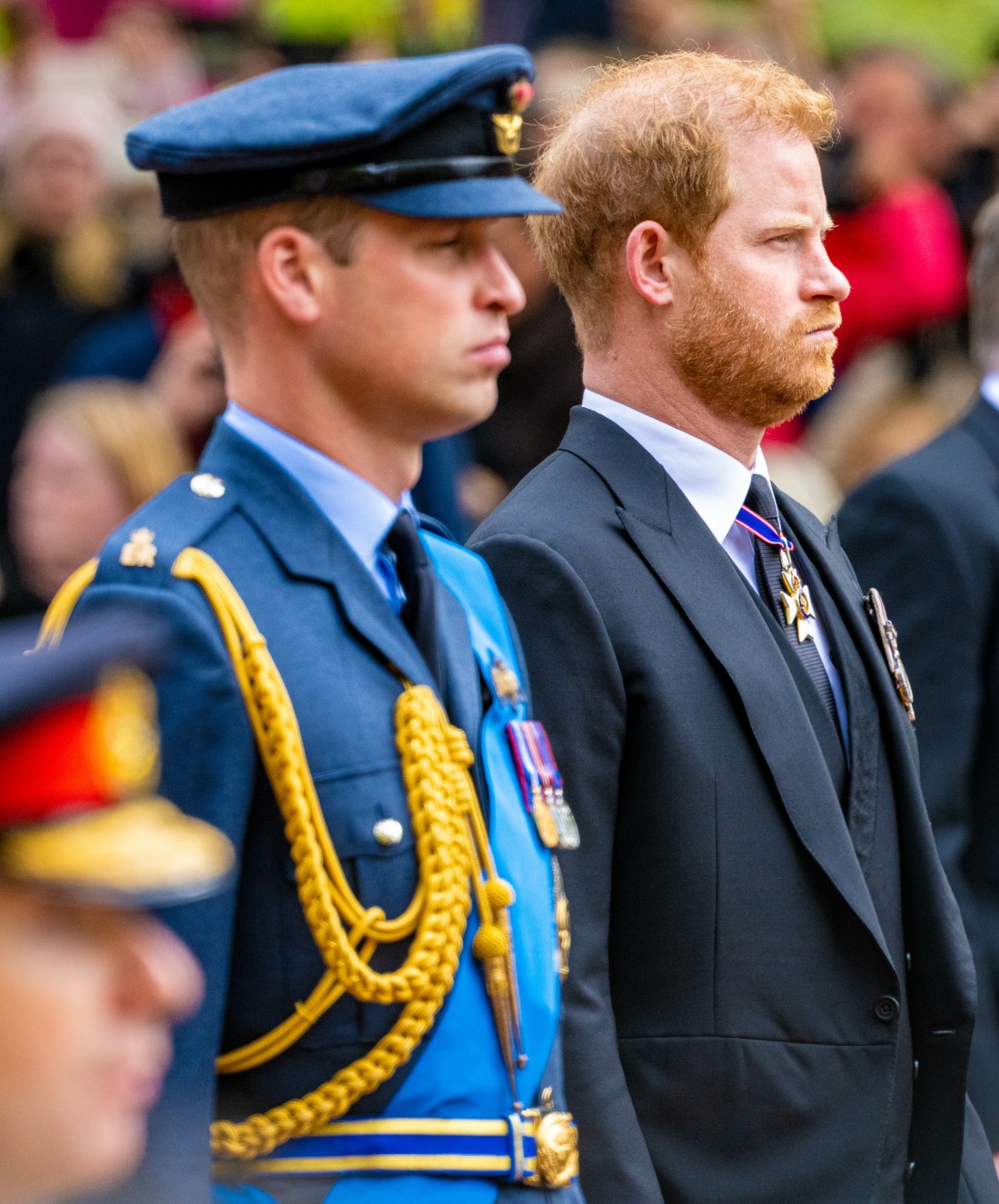 Prince William of Wales and Prince Harry Duke of Sussex follow Her Majesty the Queen’s coffin on foot as it is transported during a procession to St George’s Chapel at Windsor Castle during Queen’s state funeral in the Centre of London.