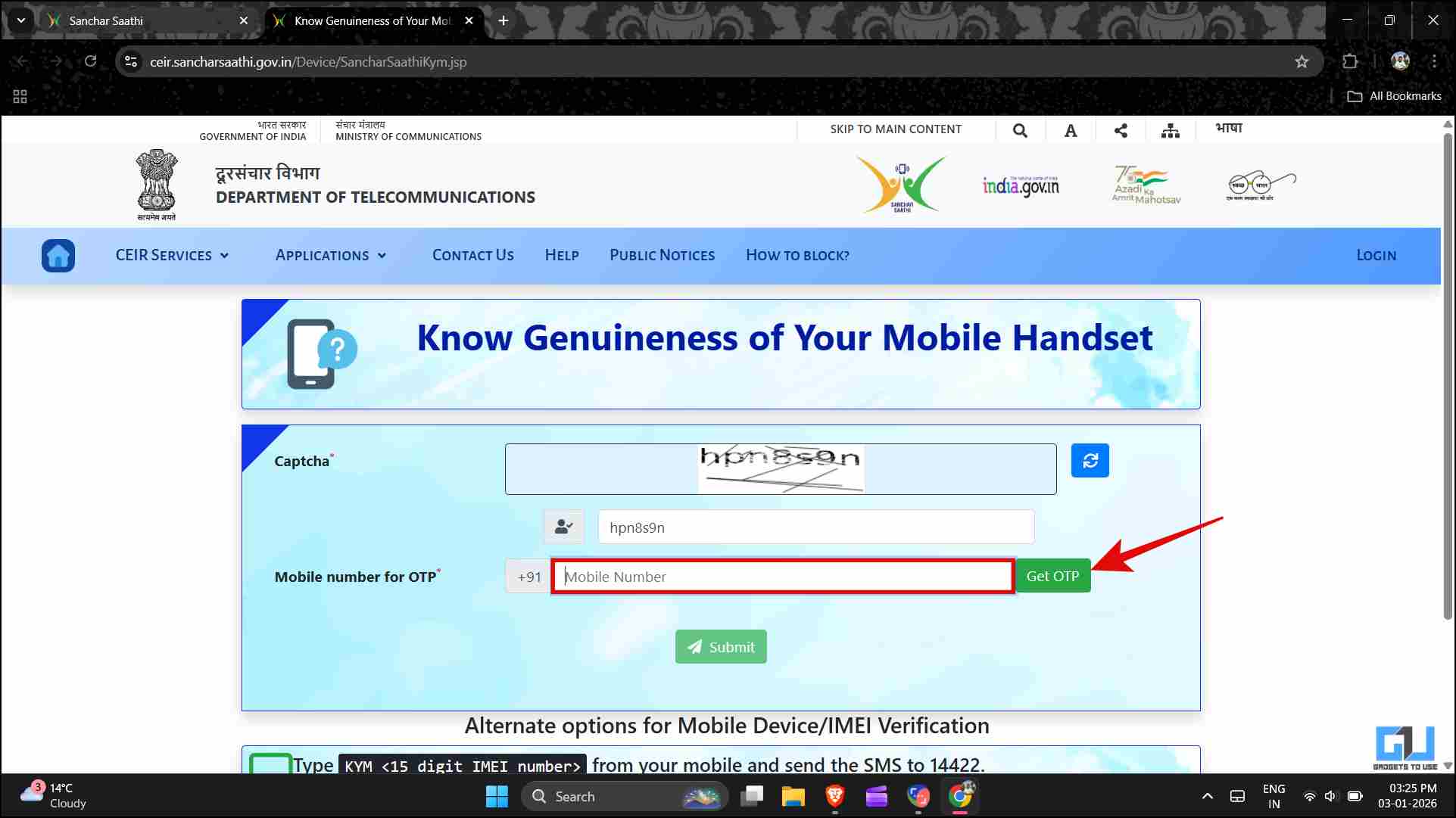 3. Once the OTP is verified, enter the IMEI number of the device you want to check. Click ‘Submit’.