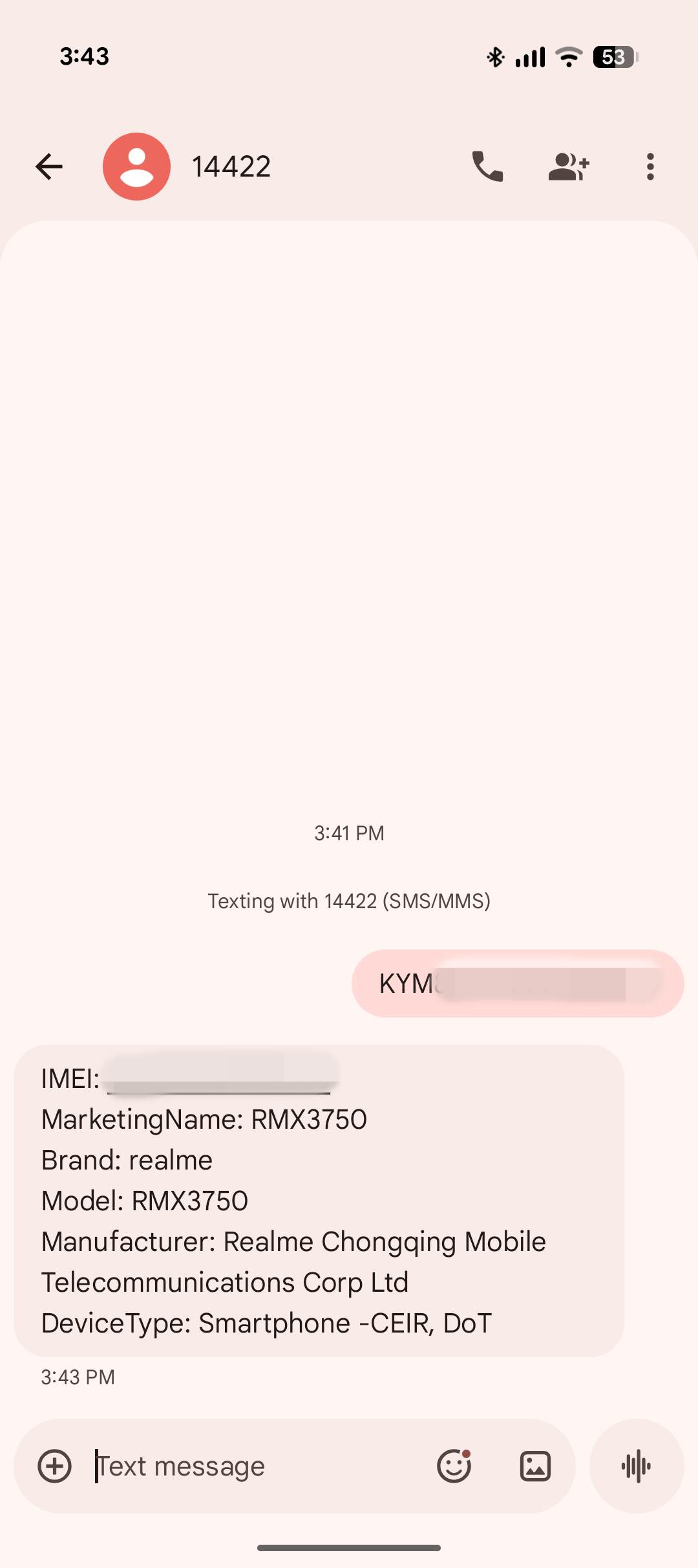 2. Type a new message – ‘KYM’ followed by the 15-digit IMEI (for example, KYM123456789012345)