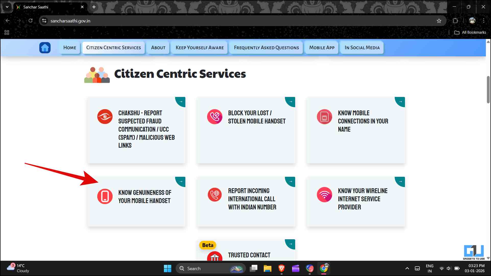 1. Open the Sanchar Saathi Portal. Scroll down, and you will find the ‘Know genuineness of your mobile handset’ option. Click on it.