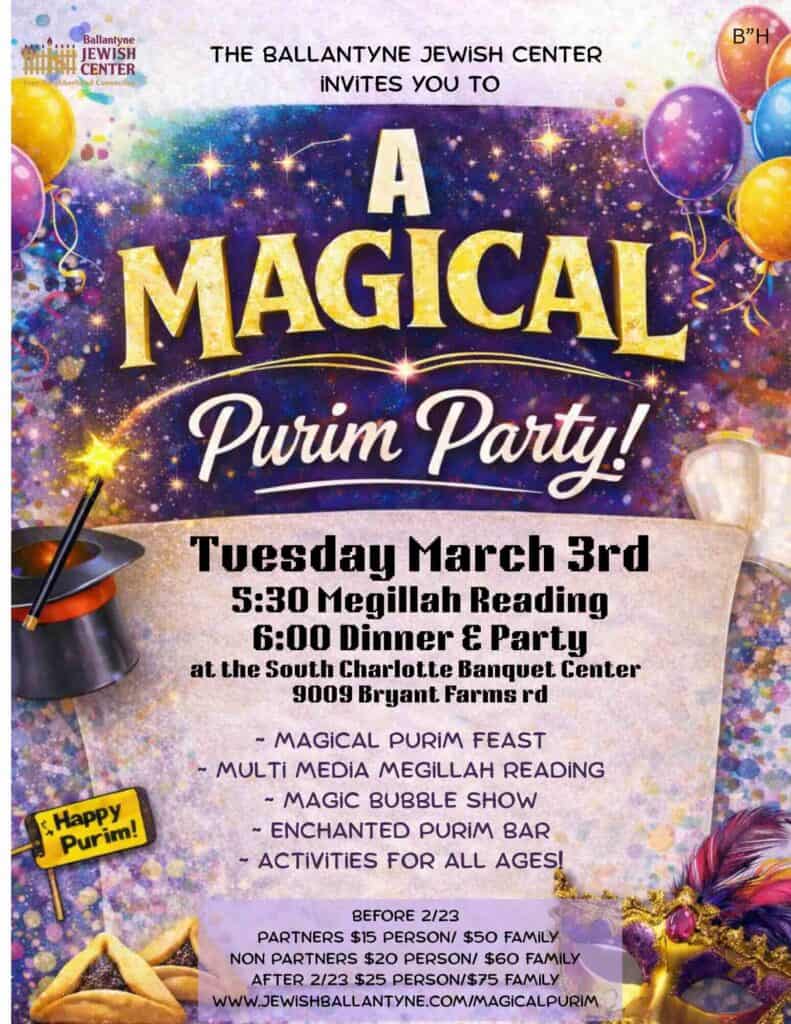 Ballantyne Jewish Center is hosting Magical Purim Party on Tuesday, March 3, 2026. The Megilla reading will be at 5:30 p.m. and the dinner and party will be at 6 p.m. It takes place at South Charlotte Banquet Center, 9009 Bryant Farms Road, Charlotte, North Carolina.