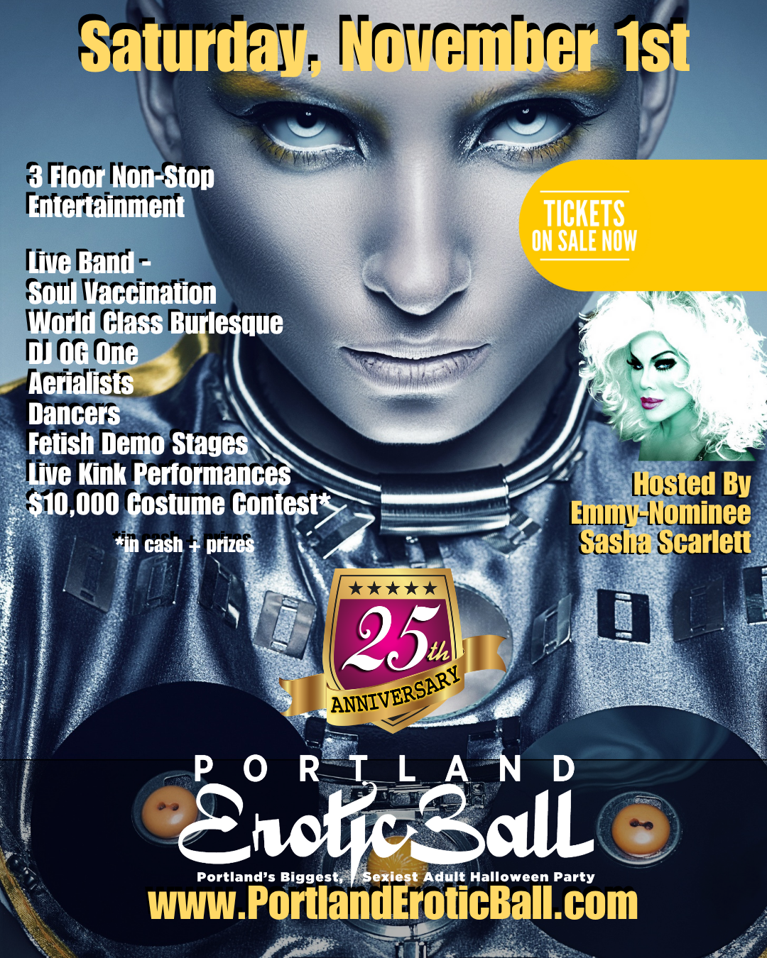The Portland Erotic Ball’s 25th Anniversary is eye-popping spectacle that includes 3 floors of non-stop entertainment, live bands, a $10,000 cash + prize costume contest, DJ OG One, world-class burlesque dancers, aerialists, circus acts, contortionists, stilt walkers, a full floor of fetish demonstrations and live kink performances on an all-new stage. The event is presided over by Emmy-nominee and hostess, Sasha Scarlett. This event sells out year after year. All lifestyles are welcome. Costumes are mandatory. Remember YOU are the PARTY, so DRESS to THRILL! We will see out for the 25th Anniversary of the legendary Portland Erotic Ball! Get your tickets now or enter to win a free pair here!