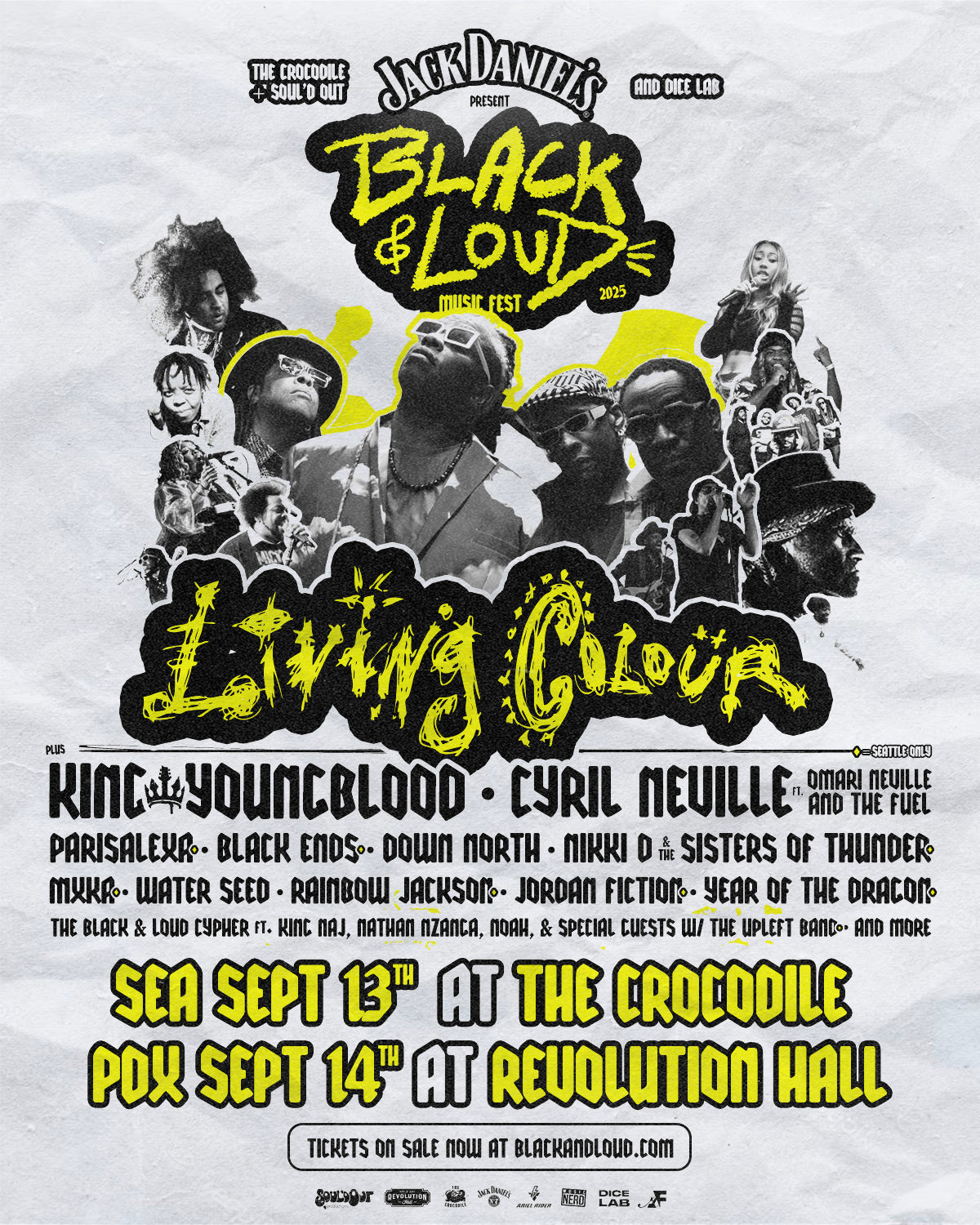 Over the last four years the Black and Loud Fest has grown from a free local artist community event in a parking lot in Seattle to a full-on music festival. This year, festival founder, producer and King Youngblood band leader Cameron Lavi-Jones with his Dreaming in Color Team have utterly outdone themselves announcing LIVING COLOUR, the iconic multi-Grammy, genre-breaking GOATs of alternative Black Rock, one of the few groups with all four original members: guitarist Vernon Reid, vocalist Corey Glover, drummer Will Calhoun, and bassist Doug Wimbish. Get your tickets now or enter to win a free pair!