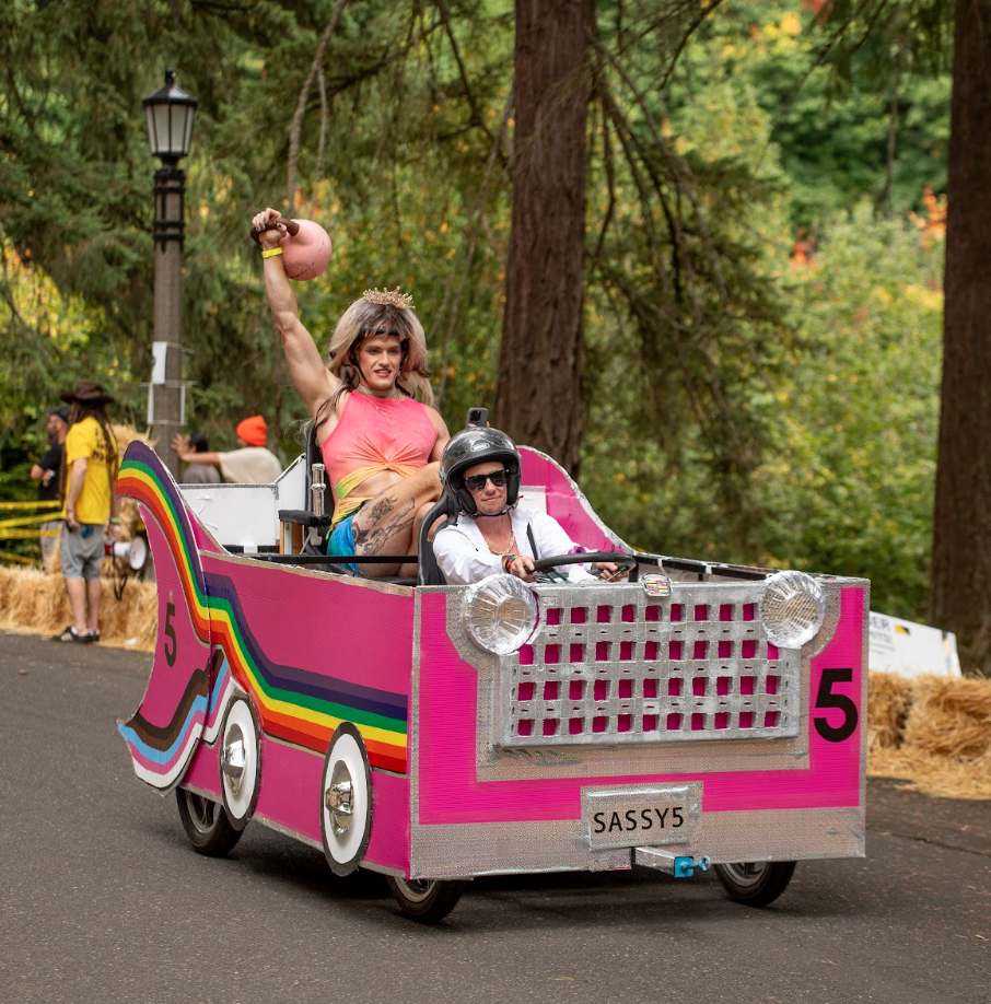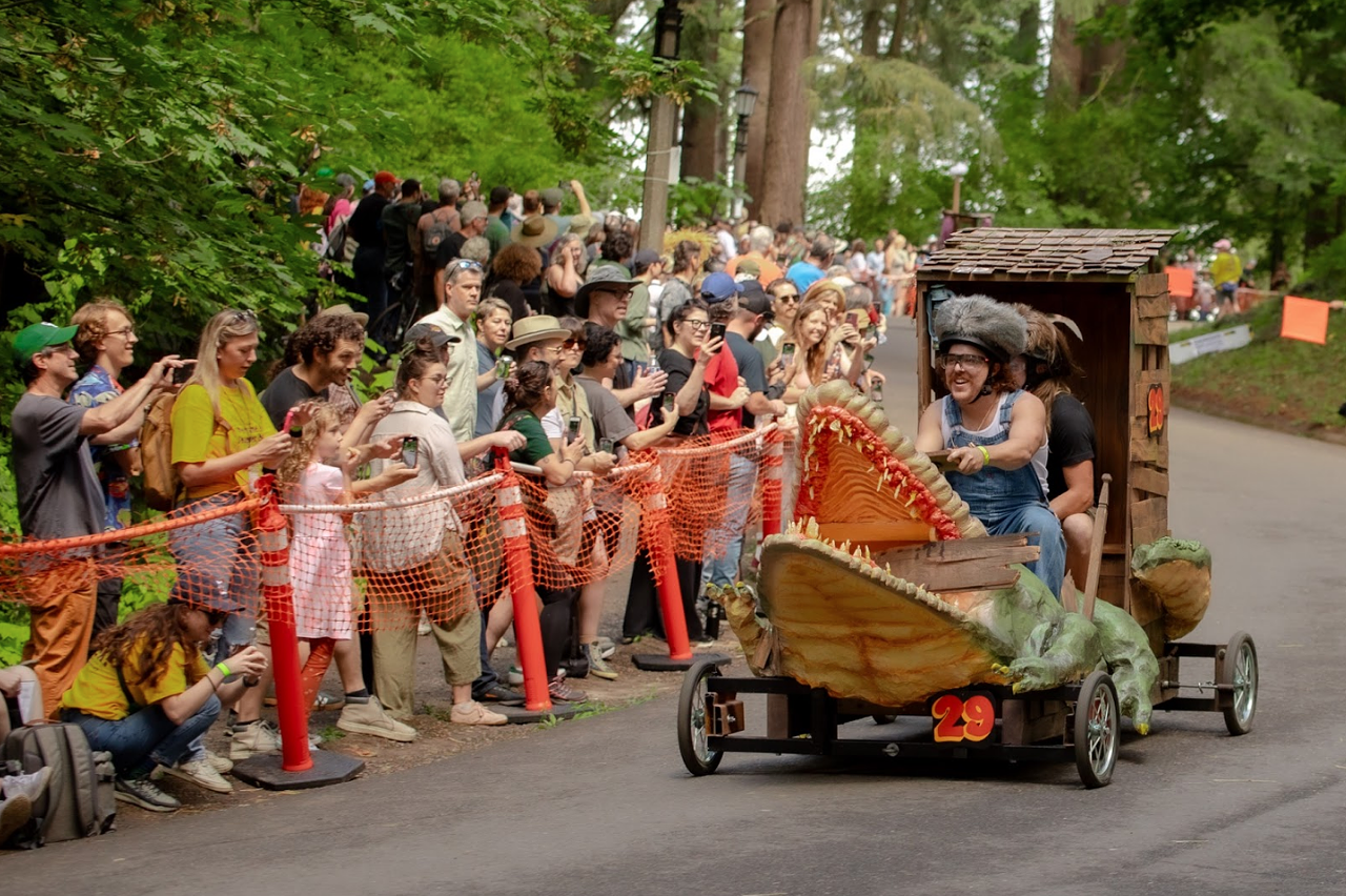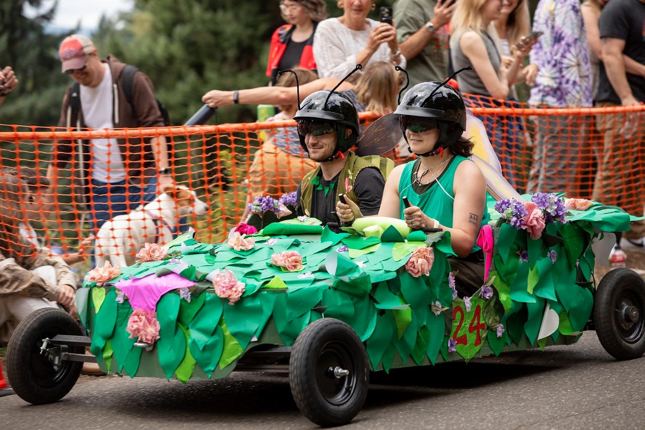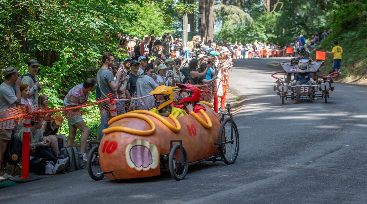 For a second, imagine you don’t live here. Deep in the southeastern part of Portland, there’s a dormant volcano. Around this volcano, there’s a massive forested public park (191 acres), with hiking trails, several reservoirs, a dog park, and a disc golf course. Every summer Portlanders huddle around the concrete walkway in the middle of the park and watch gravity-powered homemade cars hurtle down the track, from the top of the volcano to the bottom. Some cars are built for speed—sleek and low to the ground. Far more are built for artistic expression, to get the crowd hooting and hollering.