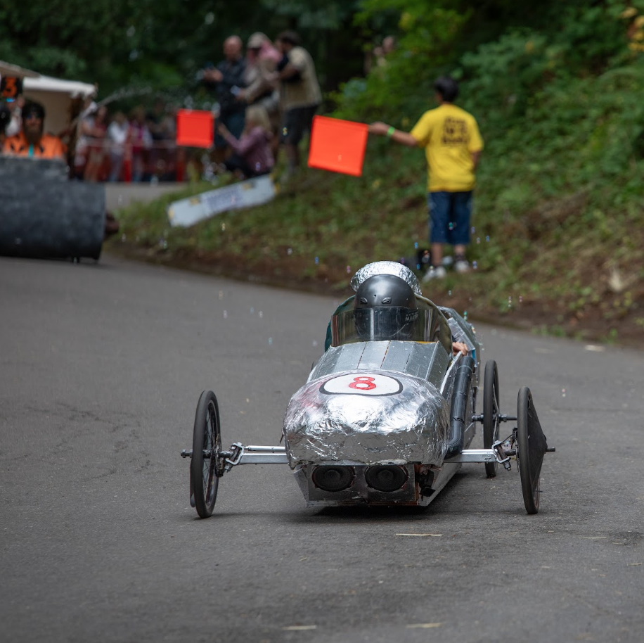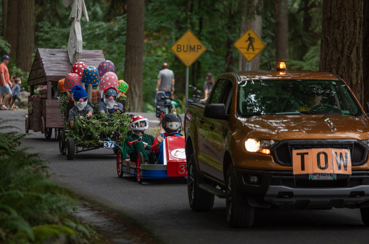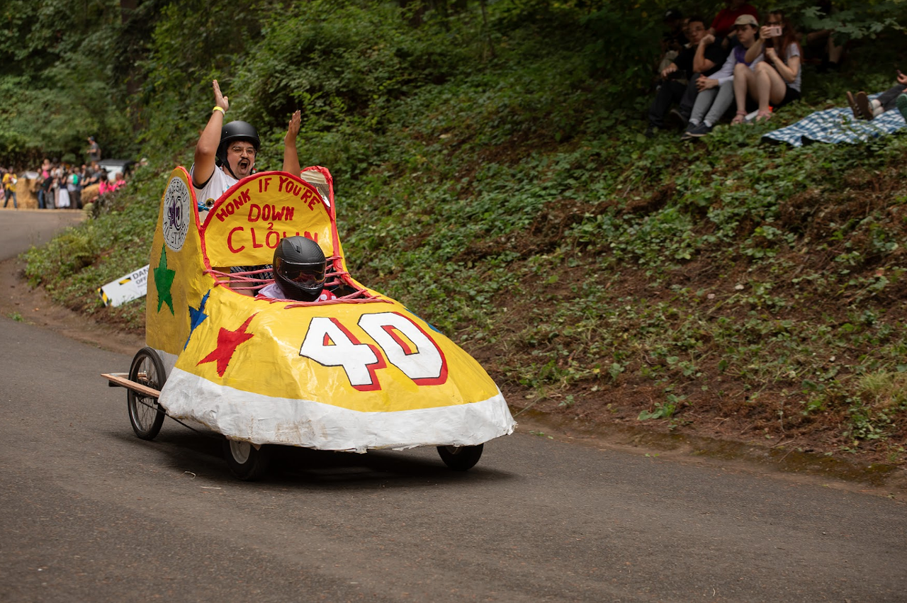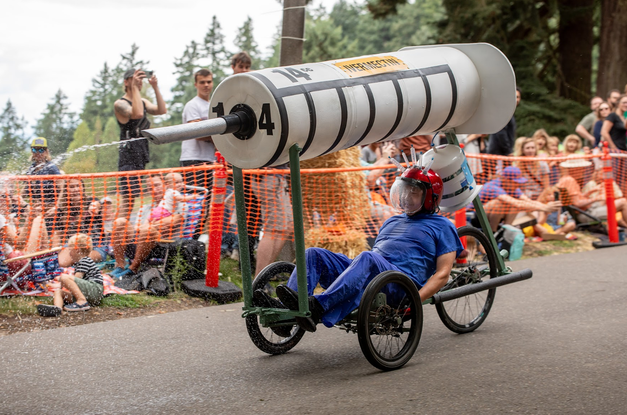 For a second, imagine you don’t live here. Deep in the southeastern part of Portland, there’s a dormant volcano. Around this volcano, there’s a massive forested public park (191 acres), with hiking trails, several reservoirs, a dog park, and a disc golf course. Every summer Portlanders huddle around the concrete walkway in the middle of the park and watch gravity-powered homemade cars hurtle down the track, from the top of the volcano to the bottom. Some cars are built for speed—sleek and low to the ground. Far more are built for artistic expression, to get the crowd hooting and hollering.