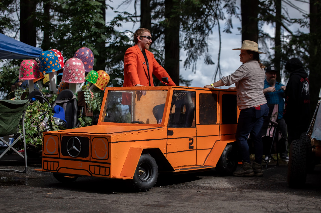 If you’ve never had the pleasure of attending, here’s how the Adult Soapbox Derby works: At the top of Mt. Tabor, near the playground, there’s a large pit area where drivers loll about, putting finishing touches on their vehicles, and talking to passers-by about their creations. If you made your car look like Lightning McQueen—like Max Strand and the Benchmade Knife Company team—you let kids sit in the driver’s seat and get some pictures.
