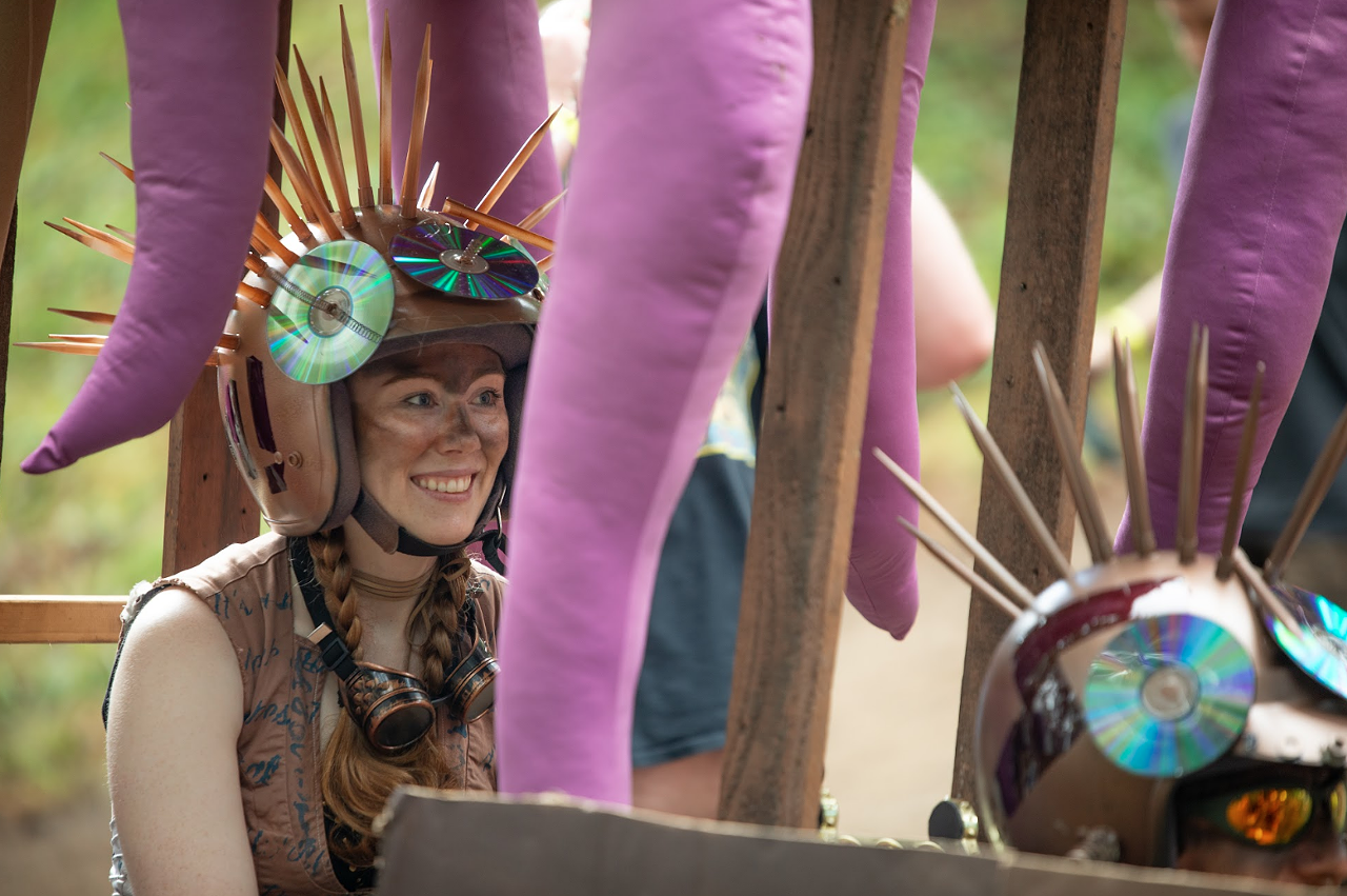 For a period between rounds, people can walk up and down the track—but when it’s time to get going, a clutch of megaphone-sporting volunteers rush everyone off so the next cars can start. Some of these vehicles—the smaller, sleeker ones that are lower to the ground—really start to haul ass as they get halfway down the hill. Other carts don’t go as fast, but they content themselves by looking cool, weird, funny, whatever. One car, the fan favorite this year, was a gigantic slice of cheese, populated by drivers dressed as mice. Some of these jokers amuse themselves by blasting startling quantities of water into the crowd.