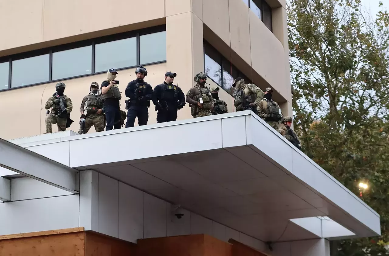 Some agents shot pepper balls from the rooftops at protesters standing outside the facility. Just before 6 pm, federal agents again exited the facility, throwing tear gas and flash bang grenades into a crowd of roughly 300 people. The cloud of gas and smoke held in the air outside of an affordable housing complex adjacent to the facility, hovering two blocks away for several minutes. Portland Police Bureau officers looked on as they blockaded Macadam Avenue with their vehicles during the clash.