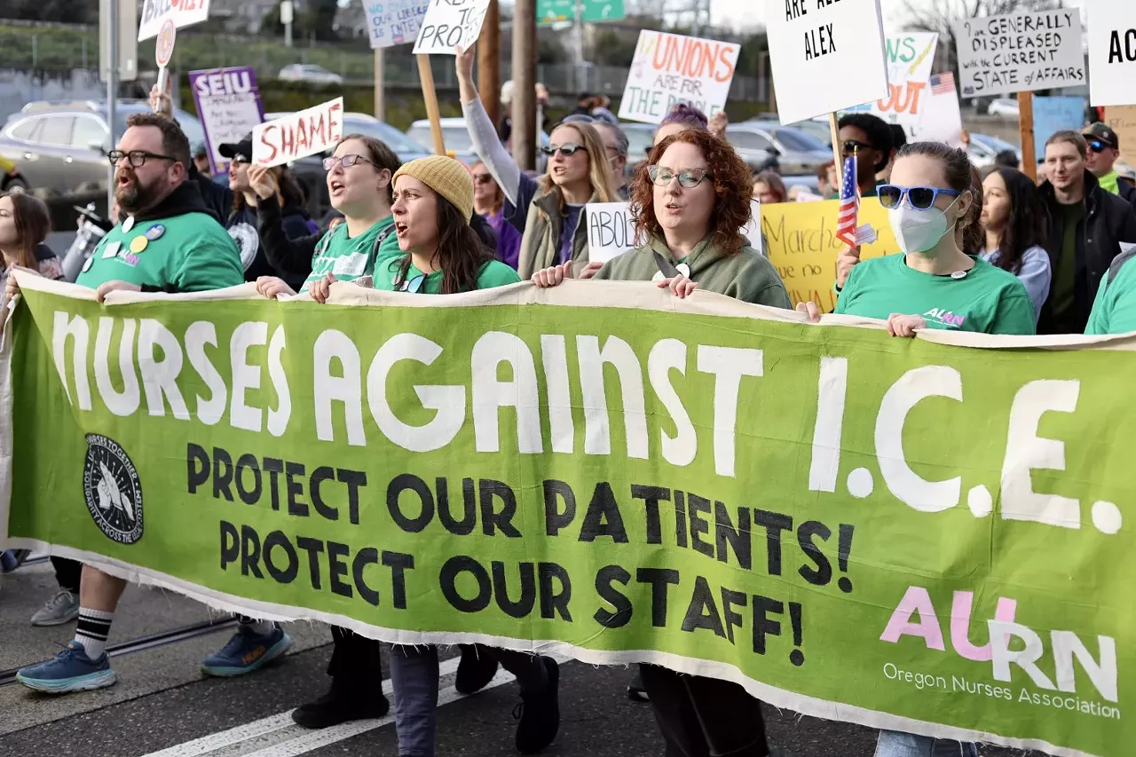 The labor rally coalesced with a large group of people on bikes who joined the protest in support of Alex Pretti, who was killed by federal agents in Minneapolis on January 24, while observing and recording the agents’ response to protests in the city. Similar rides took place in Minneapolis and hundreds of other cities to honor Pretti, who was a cyclist in Minnesota. Pretti was also a Veterans Affairs (VA) intensive care unit nurse and union member. Many people held signs honoring Pretti and Renee Good, another Minneapolis resident who was killed by federal agents earlier in January.