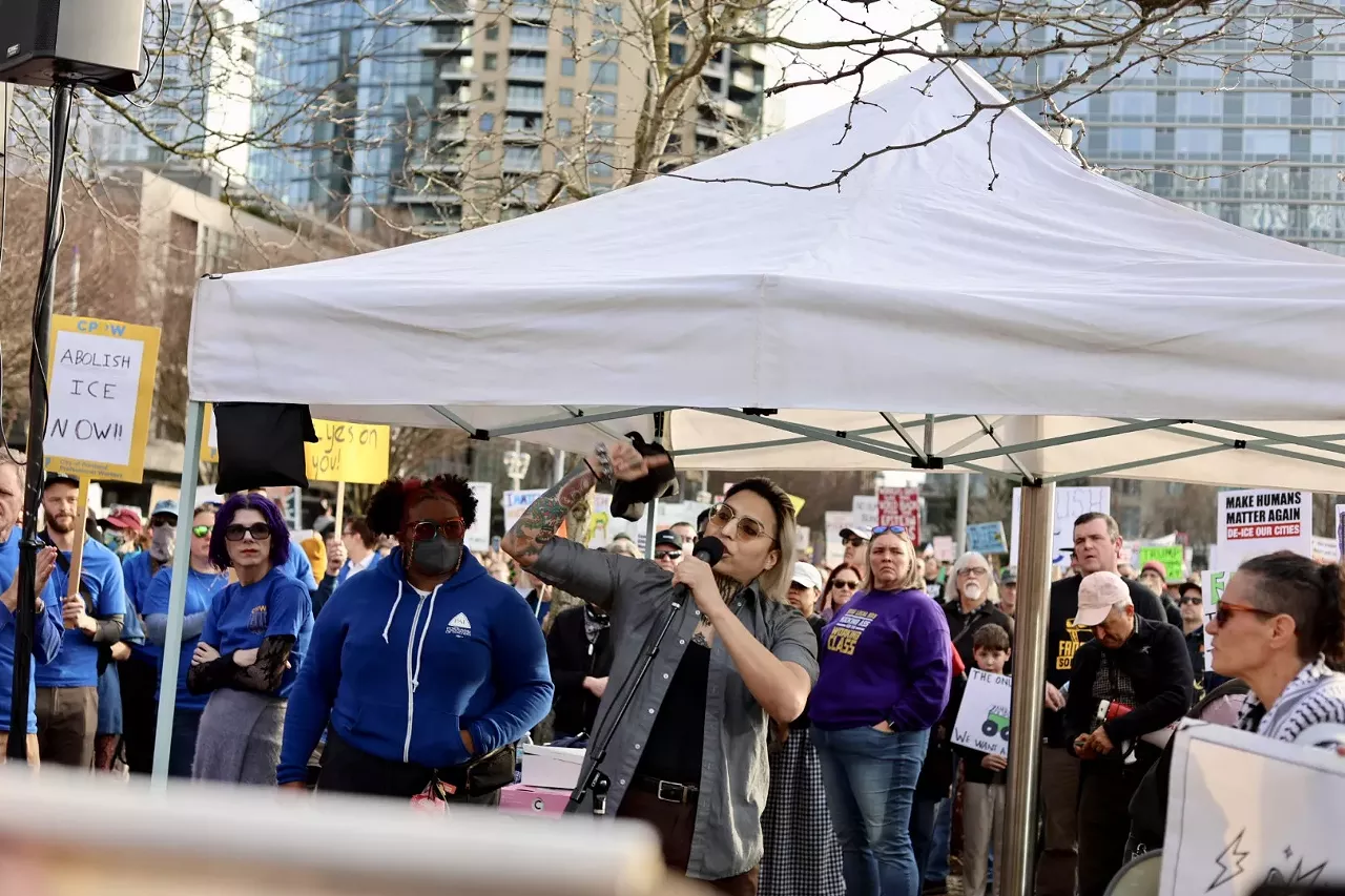 The rally began at Elizabeth Caruthers Park, a few blocks north of the ICE facility, around 3 pm. A roster of local union leaders spoke to the growing crowd, emphasizing the importance of solidarity among organized labor and marginalized groups currently being targeted by President Trump’s administration.