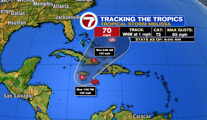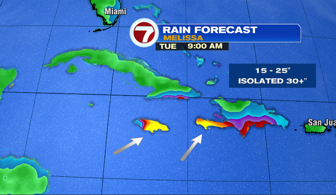 In the tropics, Melissa was nearing hurricane strength as of the 8:00 advisory. It is still expected to undergo rapid intensification this weekend and become a major hurricane. The storm is nearly stationary over very warm Caribbean waters and will not be quick to move. Catastrophic flash flooding and numerous landslides will be big threats over the next few days for Jamaica and Hispanola. Expected rainfall amounts are alarming through Tuesday.