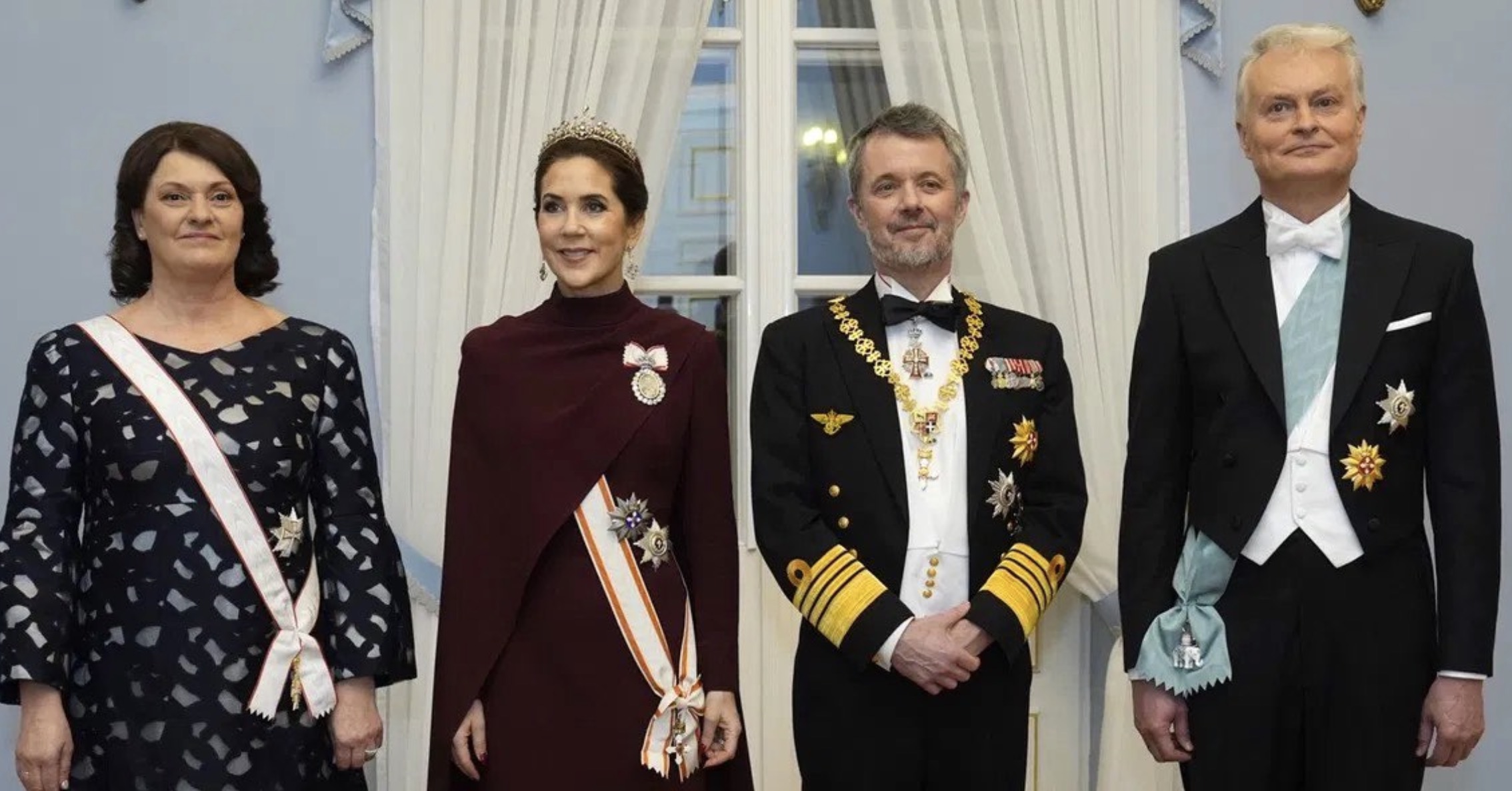 Queen Mary wore her Diamond Necklace Tiara and Diamond Earrings with King Frederik X’s Portrait Order, and the Grand Cross of the Order of Vytautas the Great.
