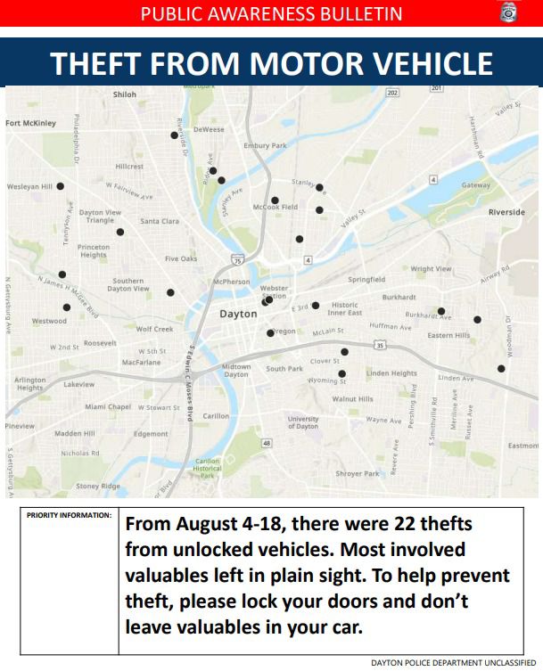 “To help prevent theft, please lock your doors and don’t leave valuables in your car,” Dayton Police Department wrote in a Facebook post.