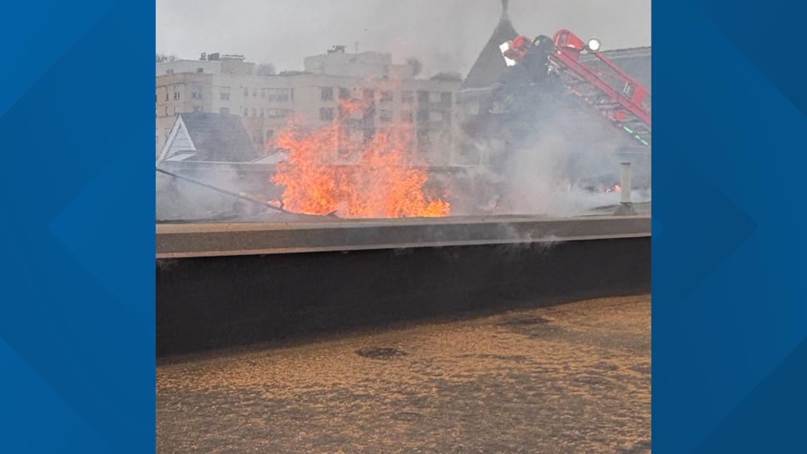 Photographs from the scene show flames shooting through the roof.