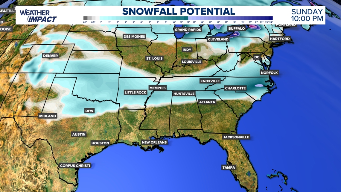Based on the latest forecast models, most of the predicted snowfall will range from far North Texas to Oklahoma out east. The swath of wintry weather will be heavily driven by the movement and track of storm center. It’s crucial to stay up to date with local meteorologists and daily forecasts as changes will occur through the week.