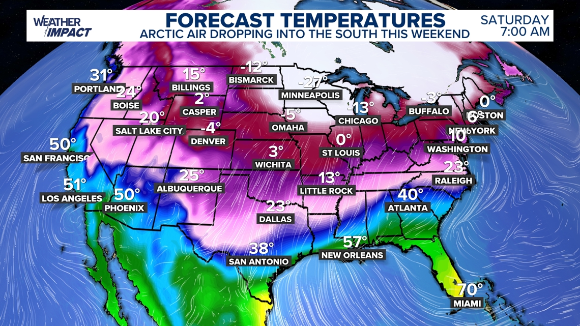 This blast of cold air is now forecast to impact southern states this weekend, including Texas, Louisiana, Arkansas, and parts of the Southeast. Along with the cold, there is the potential for cold rain, freezing rain, ice, and even some snow.