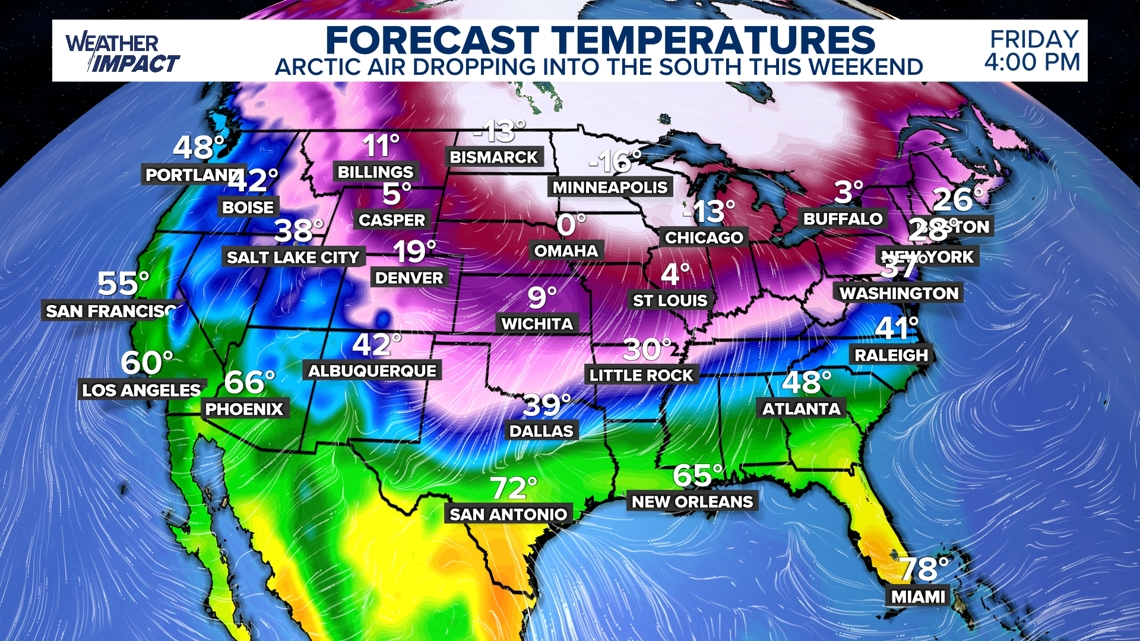 It’ll race southward into Texas, Louisiana, and the southeast between Friday night and Saturday. Strong winds and a blast of extremely cold air we start the weekend.
