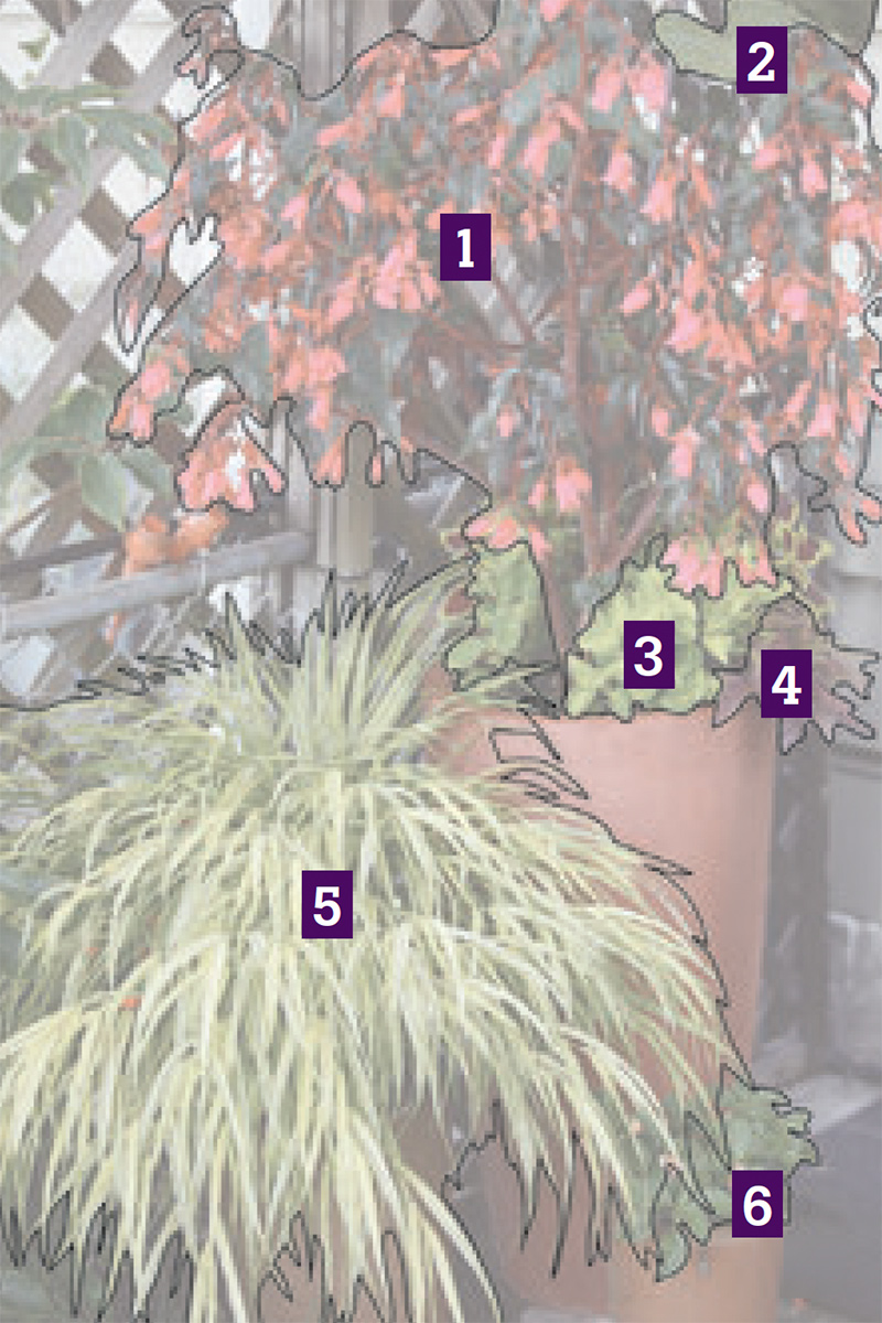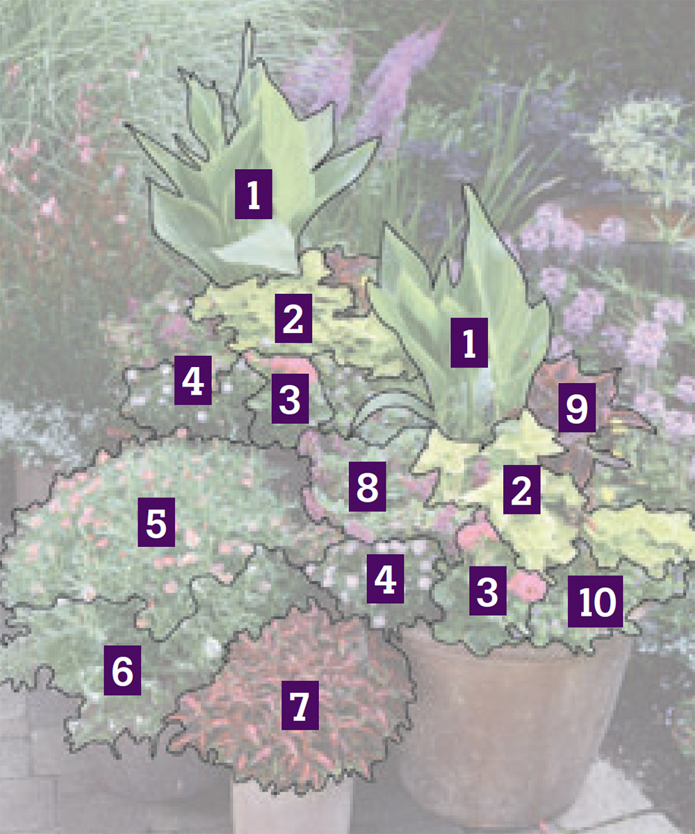 ‘Lemon Lime’ dracaena lets its leaves hang in soft arcs. Because of this habit, it’s the perfect neighbor for small plants, such as ‘Solenia Red’ begonia and these coleus, which can be nestled under the dracaena’s fronds.