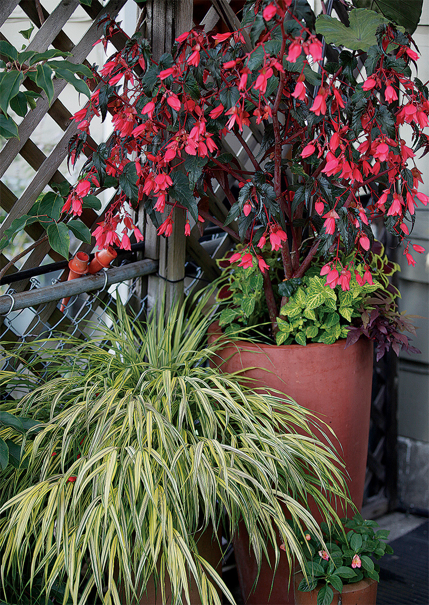 One wouldn’t expect this Japanese forest grass, this coleus, and this begonia to share a corner so peacefully. But they do, thanks to matching terra-cotta containers in graduated sizes—a common base that allows the diverse plants they hold to blend together.