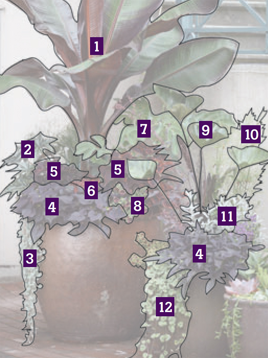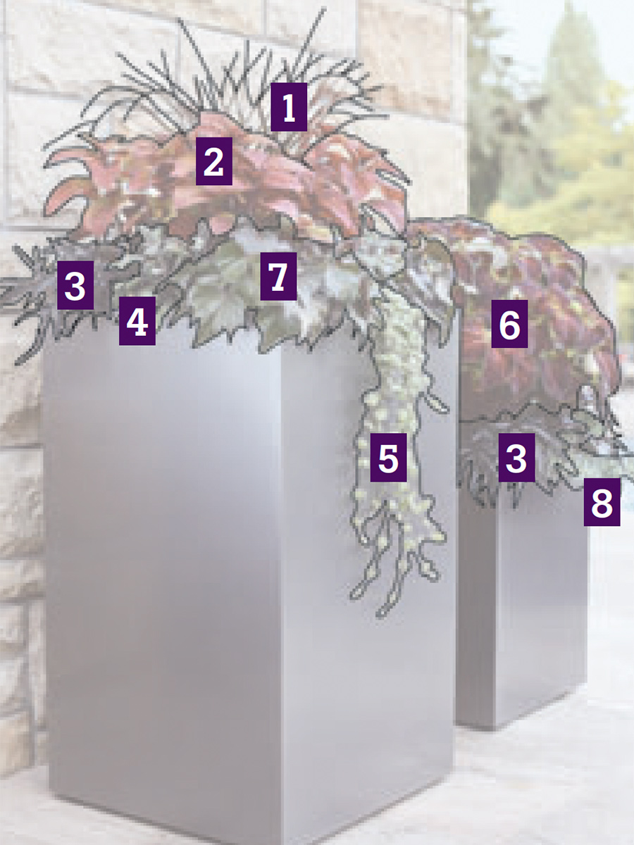 This design uses reds, greens, and a few deep purples exclusively, which allows differently shaped plants to share the same window box and urn. Texture and shape are varied but toned down and connected by color. For an extra dash of the exotic, ‘Zwartkop’ aeonium provides its pot with a succulent burst, while Baby Tut® umbrella grass tops off its container in a similar explosion.