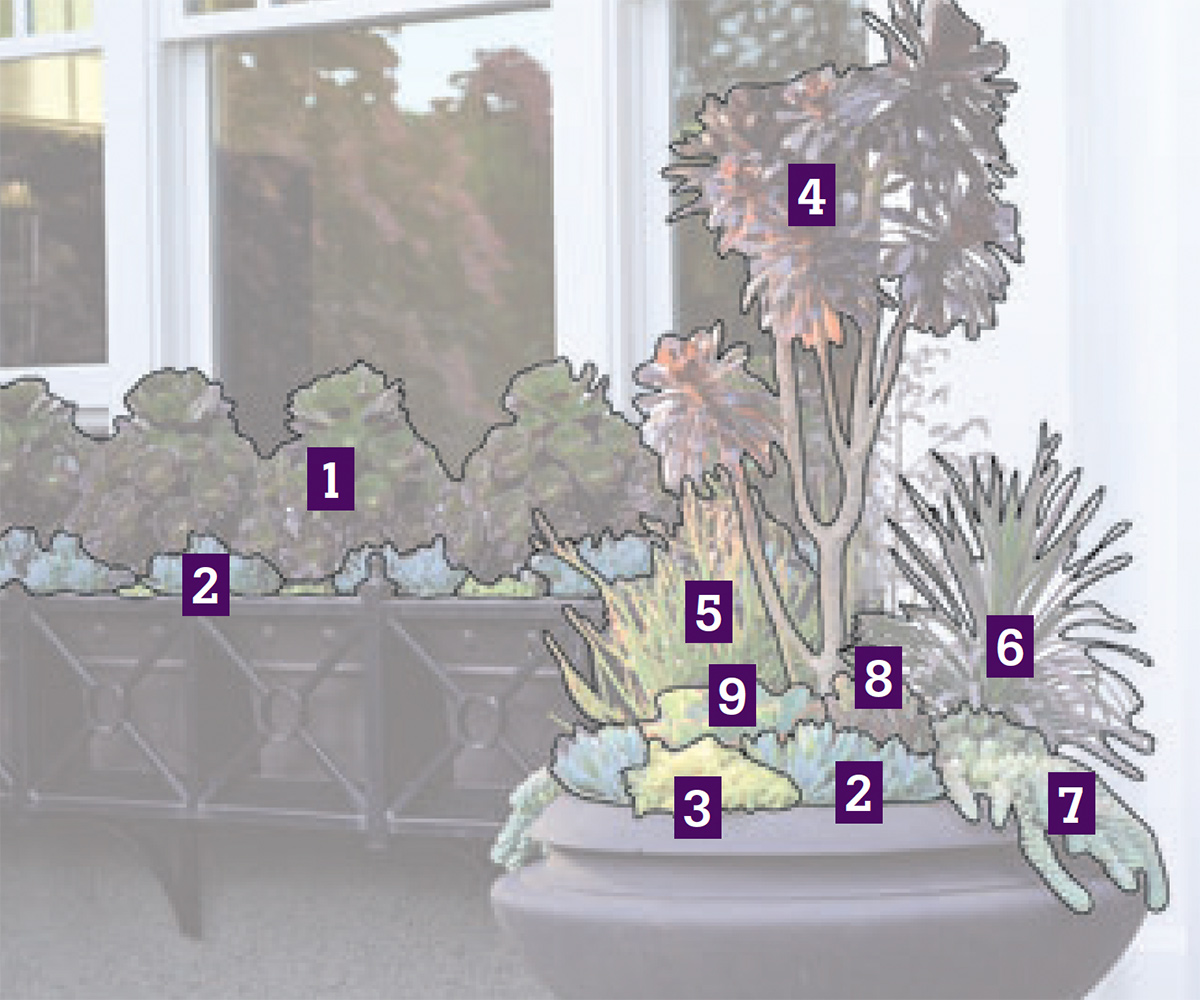 They’re nearly the same combinations: ‘Zwartkop’ and ‘Velour’ aeoniums stand tall with their petal-like leaves, surrounded by other succulents such as blue chalk sticks and ‘Ogon’ sedum. But while the window box sits in a formal, regimental pattern, the urn is made more casual by the addition of less-formal-looking plants, such as firesticks and ‘Purpurea’ dagger plant.