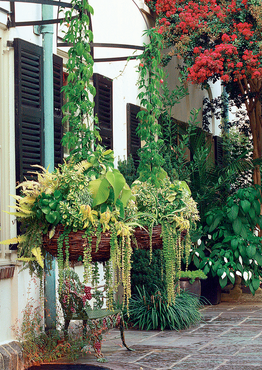 These massive hanging baskets are just overgrown enough to make the exterior feel stately yet wild. Using two baskets adds a formal touch to the scene, but growing creepers up the hanging chain and over each basket brim helps tone down the formality for something unique and salient.