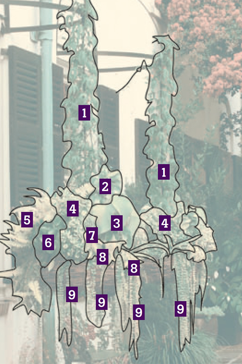 These designs are nearly doubles: boxy pots, green spillers, and purple plants atop. But the containers stand at different heights, the spillers are not the same plant, and the purple clumps on top are not the same plants. It’s clever, like a child’s can-you-spot-the-differences puzzle.