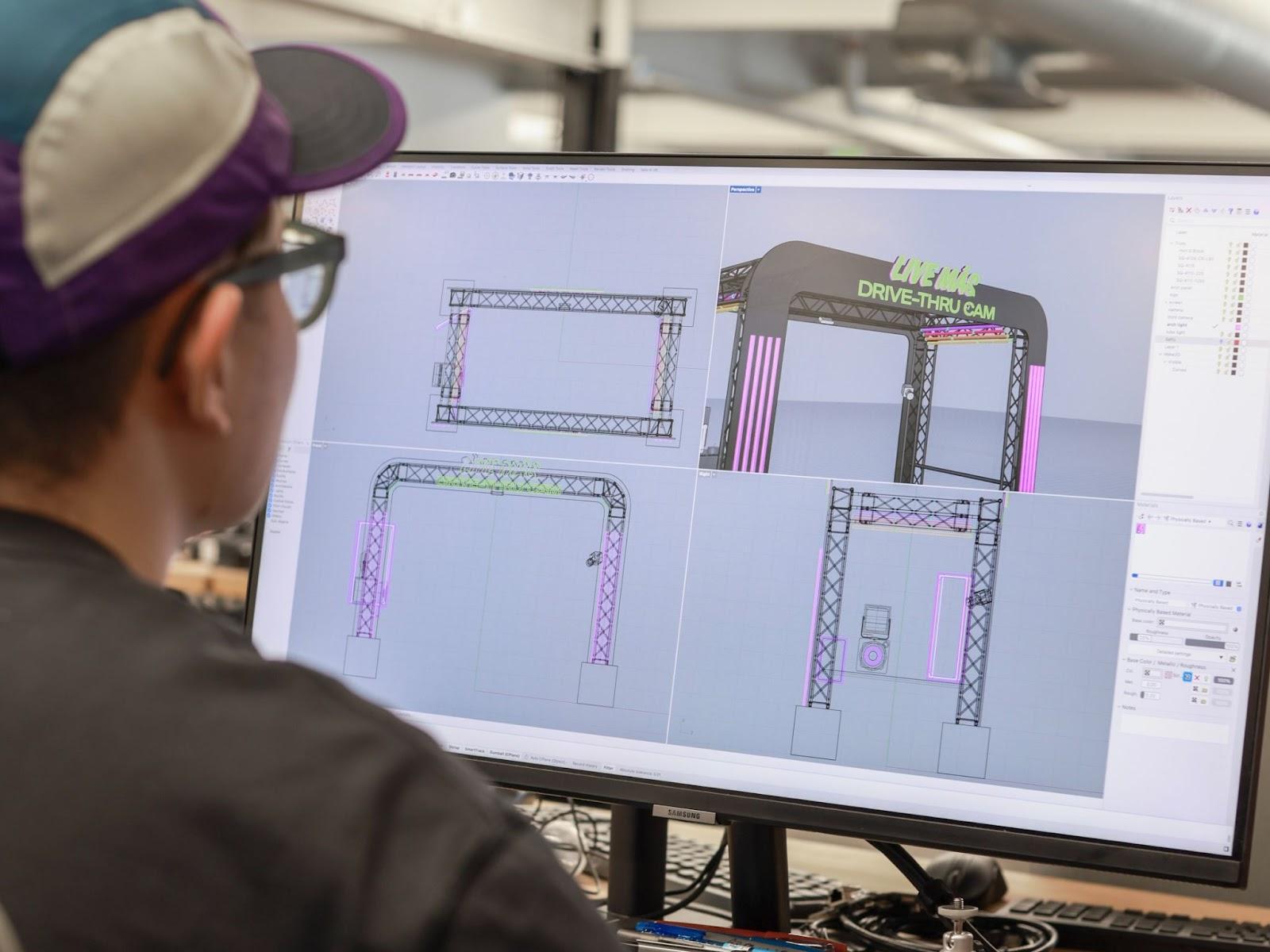 The system was designed to be frictionless. After receiving their orders, customers drove into the arch, where they were met with two giant cameras and guided prompts. The structure needed to be visually iconic, adaptable to different vehicle sizes, fast enough to avoid disrupting operations, and robust enough to withstand a multi-state tour across locations in Los Angeles, Middleburg Heights (Ohio), Cookeville (Tennessee), Houston, and Wauchula (Florida).