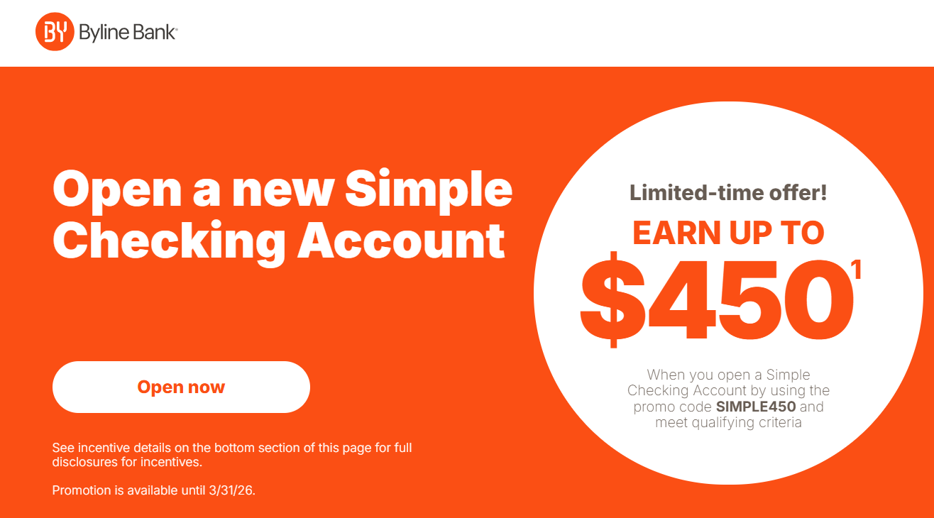 - Byline Bank is offering a $450 bonus when you open a new checking account and complete the following requirements: