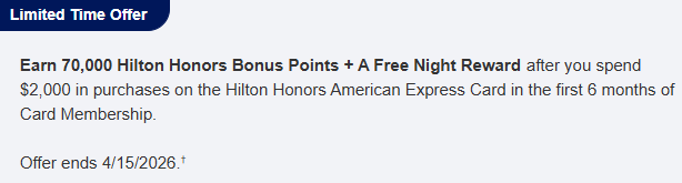 - American Express Hilton no annual fee: 70,000 points + free night reward after you spend $2,000 within the first six months