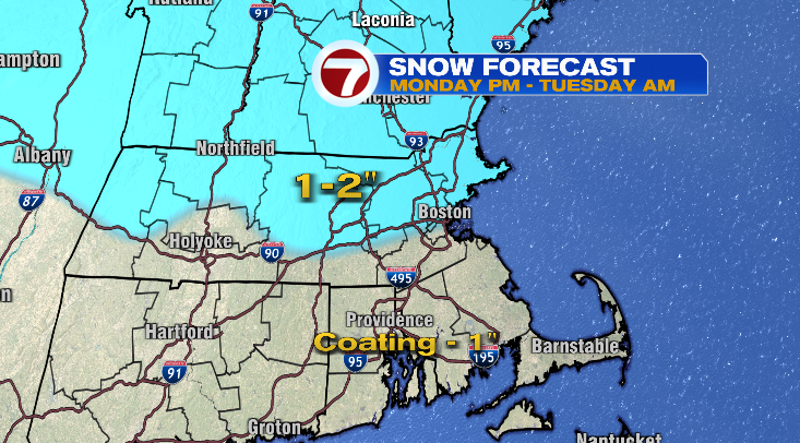 Highest snow amounts are expected north of Boston and the Mass Pike, with lower amounts to the south.