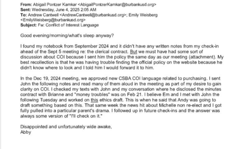 It was brought to light at the January 15 School Board meeting that an email was allegedly written by School Board member Abigail Pontzer Kamkar to both Andrew Cantwell and Emily Weisberg on June 4, 2025, where she talked about the clerical contract and the ethics involved.