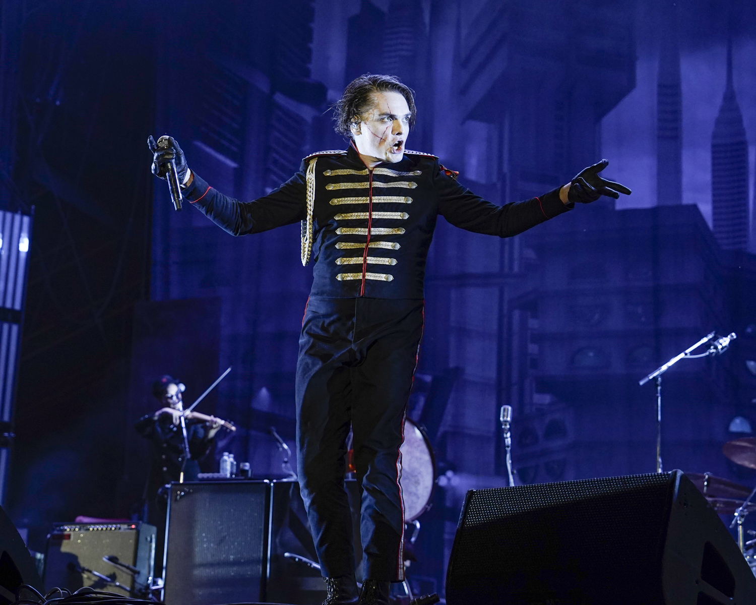 But no one commanded Saturday more than My Chemical Romance, the emo-punk band that catapulted to fame in the early aughts and is currently on a 20-year anniversary tour of its 2006 album Welcome to the Black Parade. Caked in dramatic makeup and emulating a cultish dictator, lead singer Gerard Way delivered an over-the-top dystopian opera of a performance, with band members dressed in the imperial-style military jackets they wore for the original album. Hordes of fans, ranging from older devotees from MCR’s early years to a new generation of fishnet and eyeliner-clad concertgoers, sang along to “Welcome to the Black Parade.”