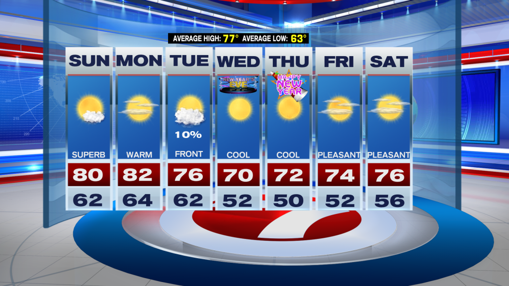 As far as the forecast goes, we’ll see temperatures in the 50s for midnight on New Years Eve, so make sure you dress warm! Despite the bright sun, highs will struggle to reach 70 on New Years Day.