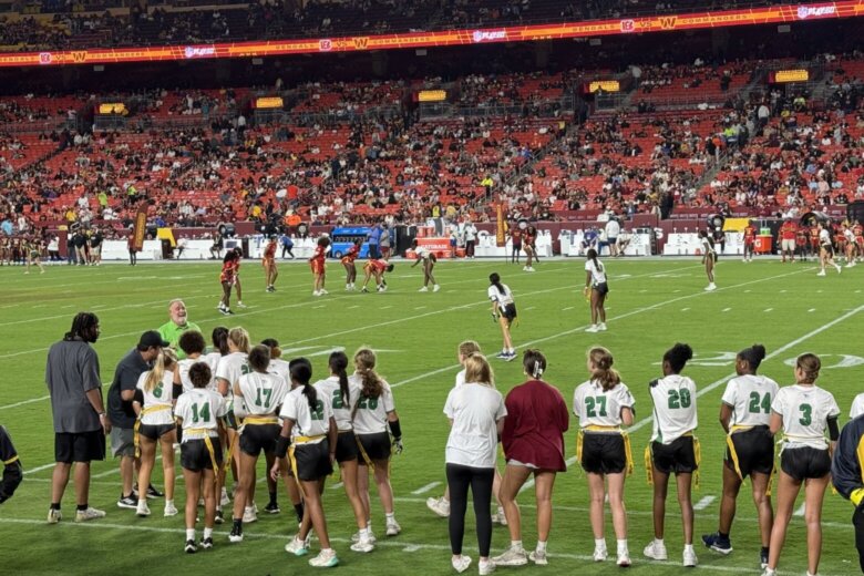 The Washington Commanders weren’t the only team preparing for their new season at Northwest Stadium on Monday night. Four high school girls’ flag football teams from Montgomery County, Maryland, scrimmaged on the field during the Commanders’ preseason game against the Cincinnati Bengals.