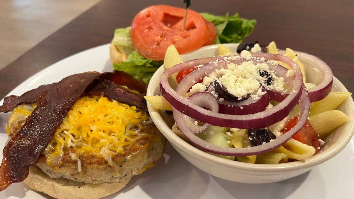 A turkey burger wtih turkey bacon and a side of pasta salad at Stacks. By Heidi Finley