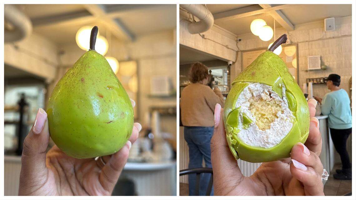 Daily Grind Coffee Bar in Waxhaw makes lifelike fruit cakes, such as the pear one shown above. What you see isn’t what you get: The “pear” pastry looks exactly like the real fruit until a bite reveals its true nature: a fluffy, moist and delicate cake center. By Tamia Boyd