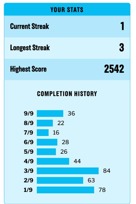 Starting on Monday, you’ll find an expanded endgame pop-up that provides a tally of your current streak, plus a record of your longest one. Below them will be a chart containing a history of how many squares you got correct each time you played. Are you consistently going nine out of nine? Now you’ll have proof of that, too.
