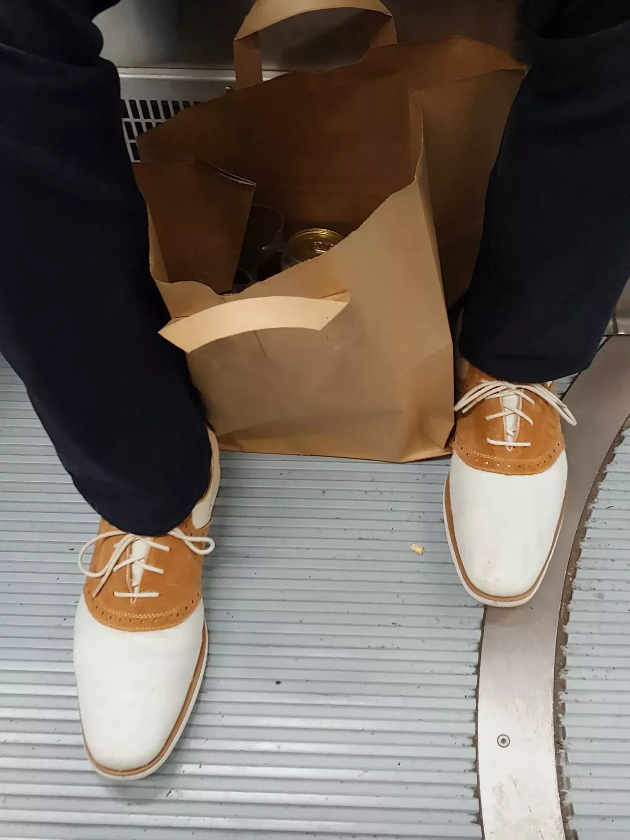 What’s the bag? A can of beer? And how much did these saddle oxfords cost? Are they the real thing? If you’ve got the cash, you can buy handmade ones. But I have a feeling these ones were mass produced. Still, they are quite handsome.
