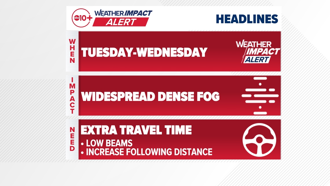 SACRAMENTO, Calif. — Weather conditions forecast for the Sacramento region Tuesday through Wednesday are calling for areas of widespread dense fog.
